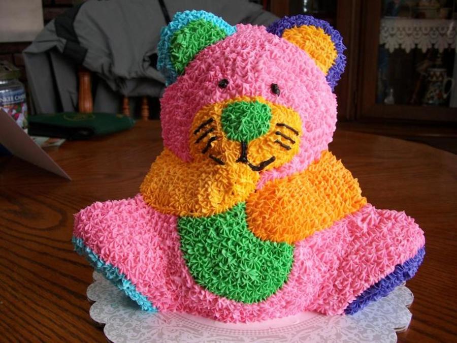 This is a pattern of a Beanie baby kitty that was the young lady's favorite toy. It is the wilton bear pan with buttercream stars...