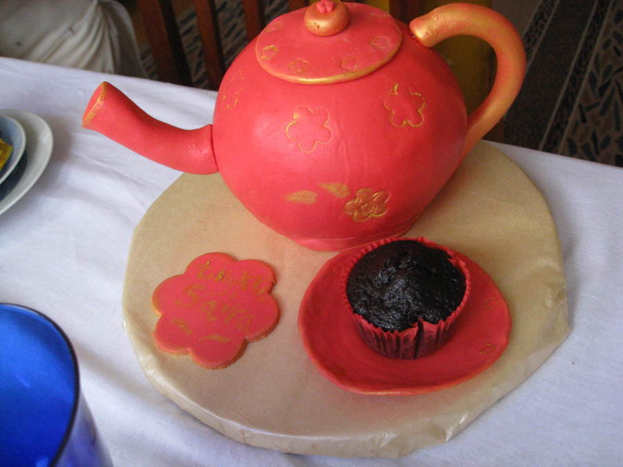 My second 3D cake ever. yellow butter cake with orange IMBC filling and covered in fondant. I had lots of accidents, I had to bake the cake twice as the first one fell apart taking out of the pan. The spout i had made to day ahead from sugerpaste, went soft again? and the fondant broke in the bottom. But it was a lot of fun making it and my daughter loved it and no one noticed all the mistakes.