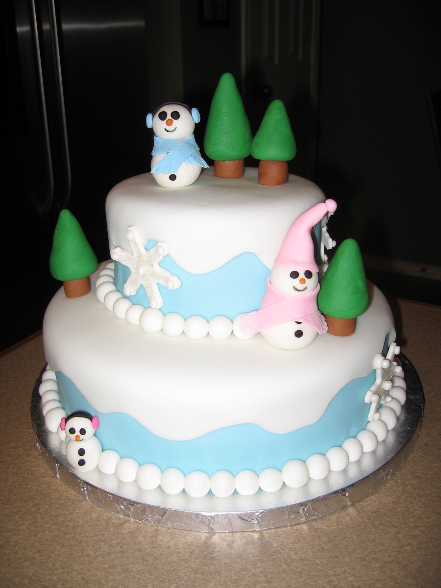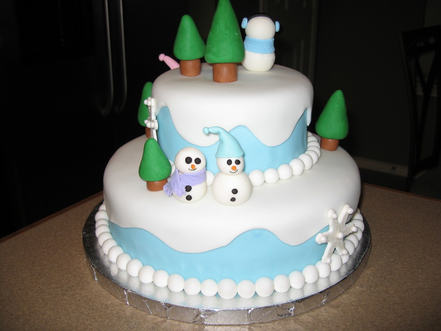 Made this cake at Christmas. Bottom tier 10", top tier 6". All covered in fondant. Snowmen and trees were a mixture of fondant and gum paste. Snowflakes were all gum paste. Got my idea from others very similar to this on CC. The only thing I don't like is how big the eyes turned out on the snowmen.