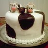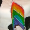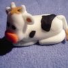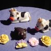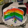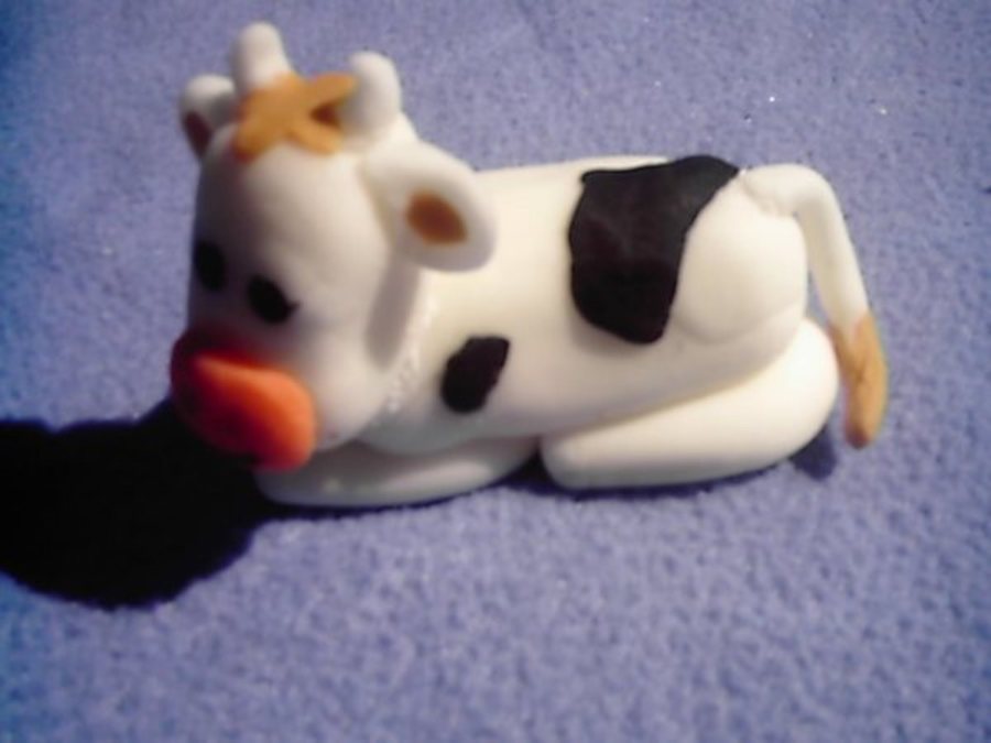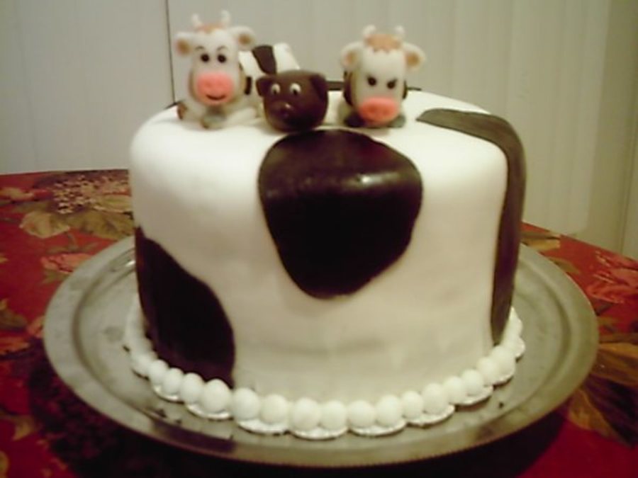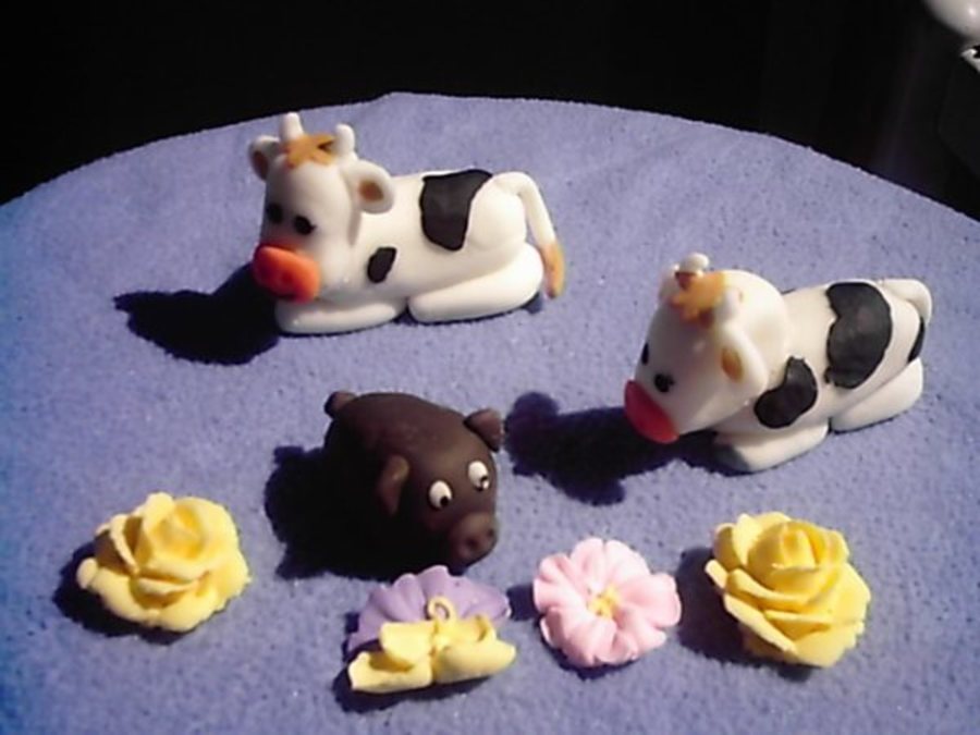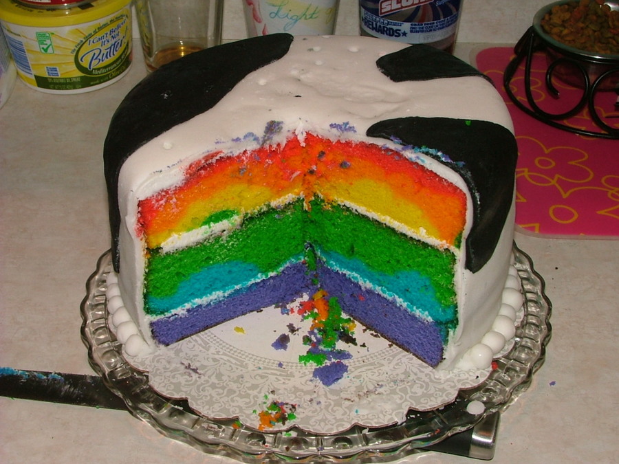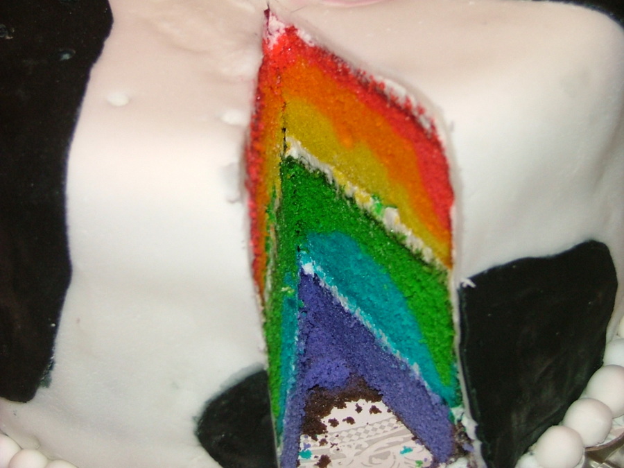 Rainbow colored white cake. White and black fondant with fondant cows and pig. My first attempt at creating figures.