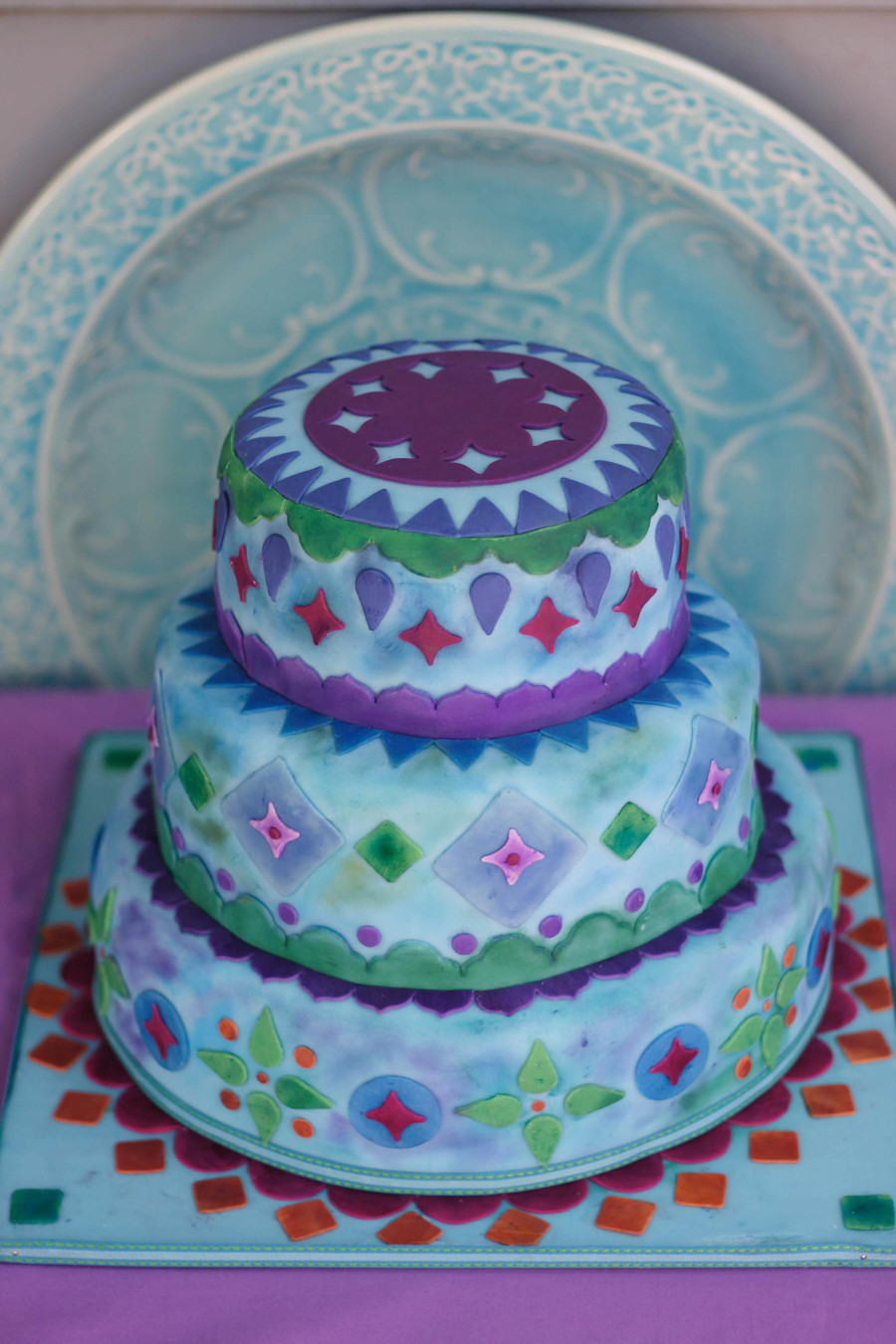 Three-tier wedding cake with chai buttercream and jasmine-scented vanilla cake. For the shading, I actually dry brushed it with powdered petal dust instead of airbrushing.