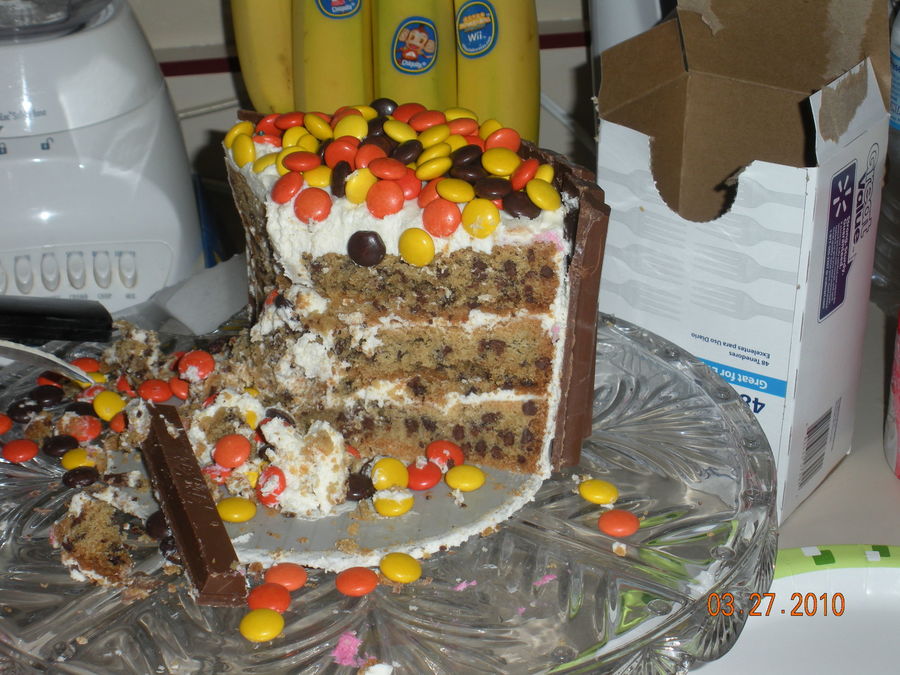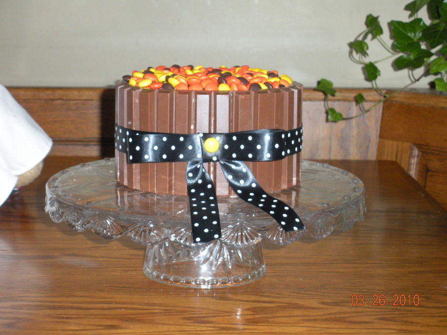 I have seen many, many pictures of the candy barrel cakes and decided that i would have to try. To my amazement it was super easy just like everyone says. I also took the idea from a member on here and made a cookie cake. If I ever do it again, I will make the cookie layers much thinner, they were kind of hard being as thick as they were.