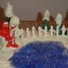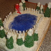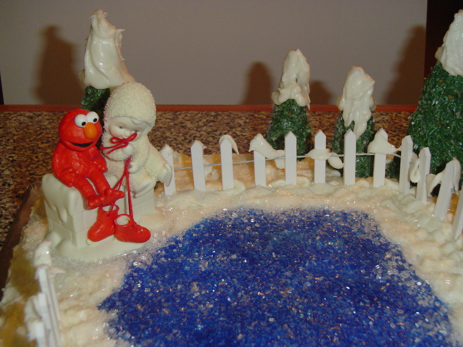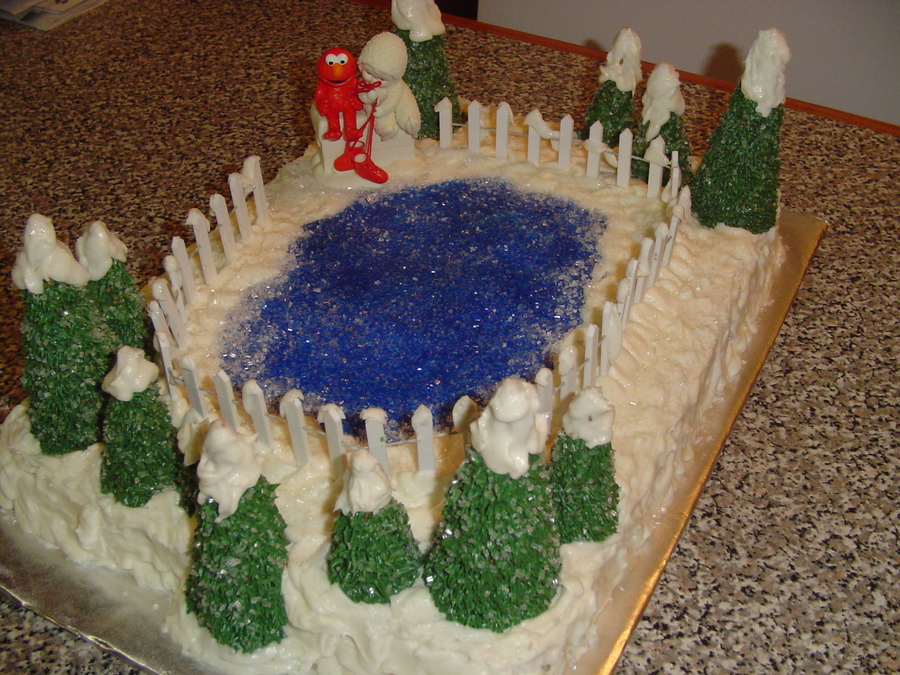 This cake was made for a 1 yr old little boy who's birthday is on Christmas eve. My brother bought the family the elmo and snow baby as a keepsake gift. i put plastic wrap under it to keep it from getting stained and told them it was there. plastic fencing bought in the christmas decorations and piped ice cream cones for the trees. I used blue piping gel and differenct colors of edible glitter on top for the frozen lake.