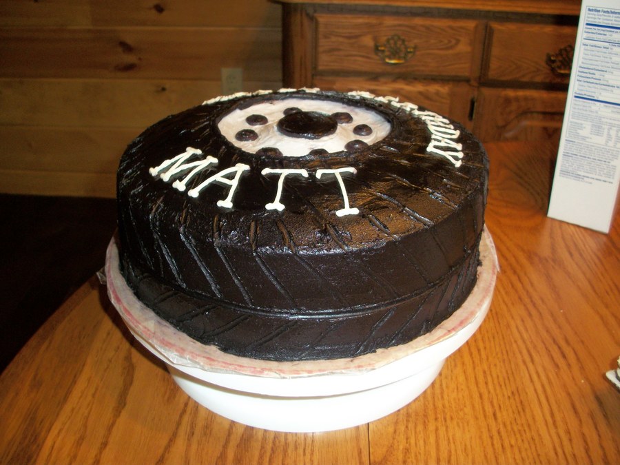 10" round chocolate cake made to look like a tire....hope it does. All btrcrm. Thanx for lookin!