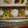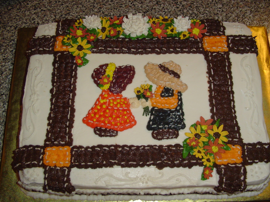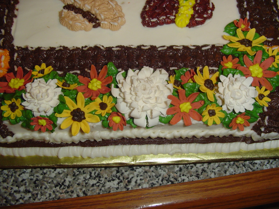 buttercream piped cake with gumpaste flowers. cake was inspired by a quilt my grandmother had made me. Turns out the grooms grandmother had made one and the home burned. only pieces of quilts remained and they were framed and given out thru the family. bride and groom loved the cake. I was really proud to be a part of their beginning.