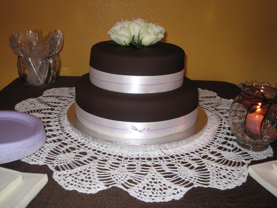 I made this cake for a baby shower. It was to be simple and elegant and it loks a lot like a wedding cake to me, but they loved it. I used Chocolate buttercream under the chocolate fondant and then attached satin ribbons. I used fresh roses for the top which was part of the shower theme.