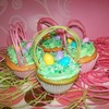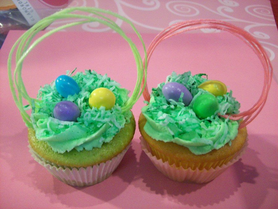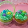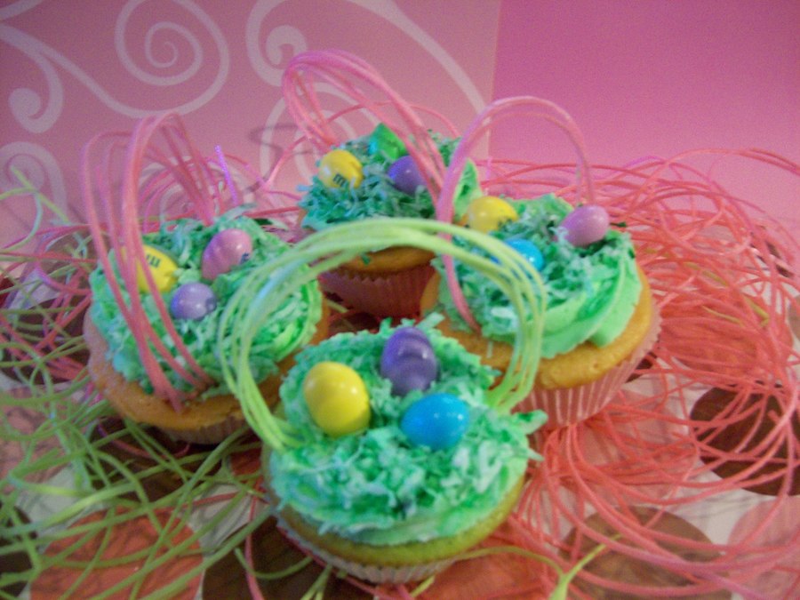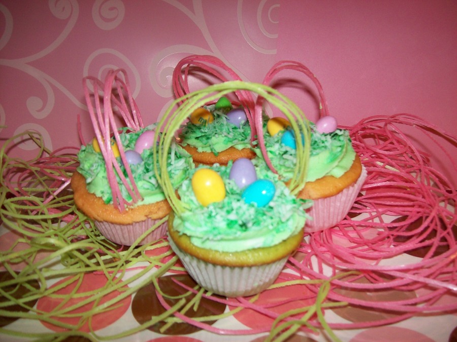 I did a couple dozen yellow cupcakes. Half was dyed green and the other dyed pink. Buttercream icing and green colored coconut topping. Its all edible. The band around the top is an edible basket filler i found at Micheals.
