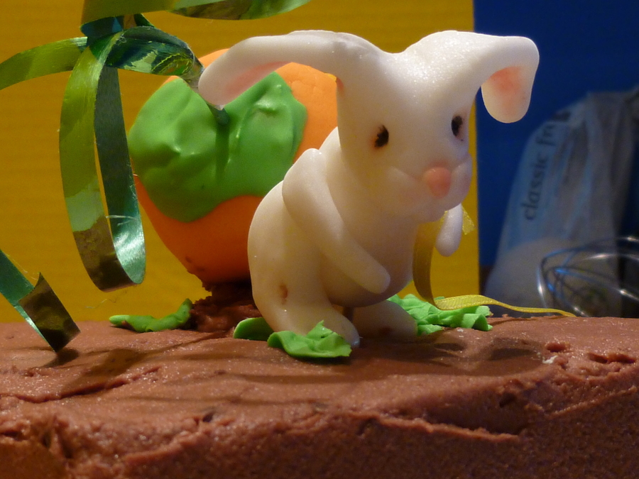 For a school Easter party. Bunny dragging a giant carrot. Bunny handformed with fondant. Carrot made from Rice Krispie Treats and wrapped in fondant.