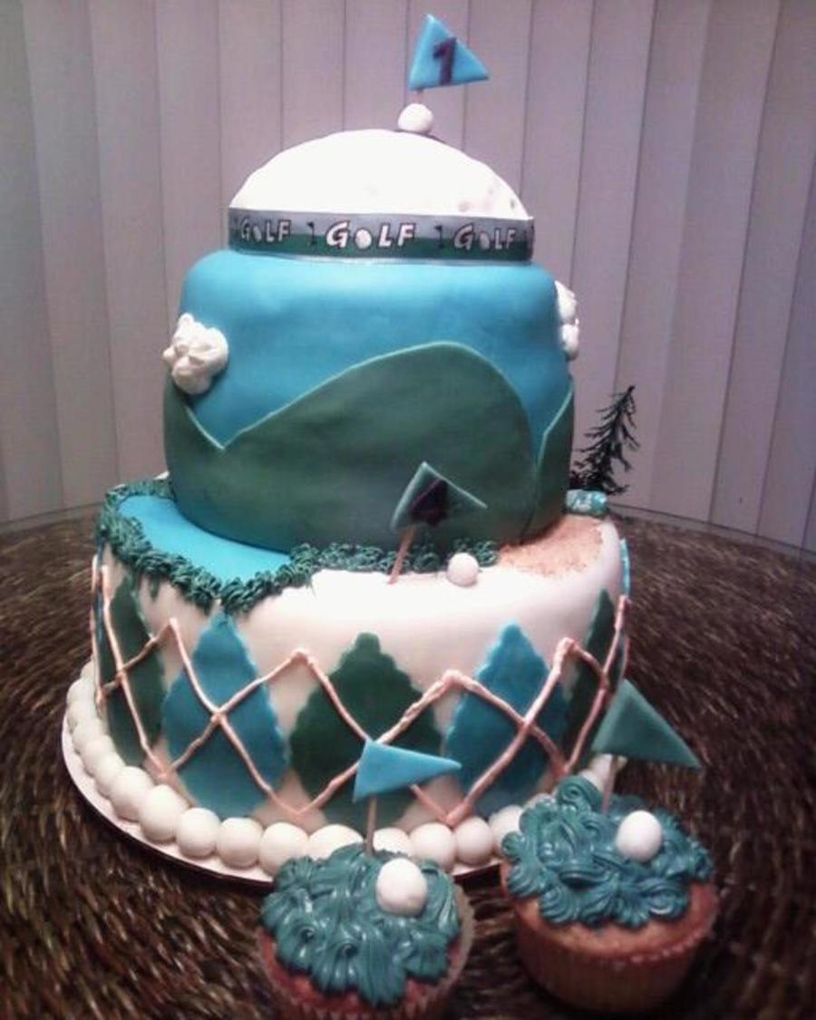 2 tier golf cake. the top golf ball is cake covered with fondant.