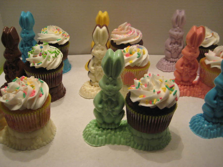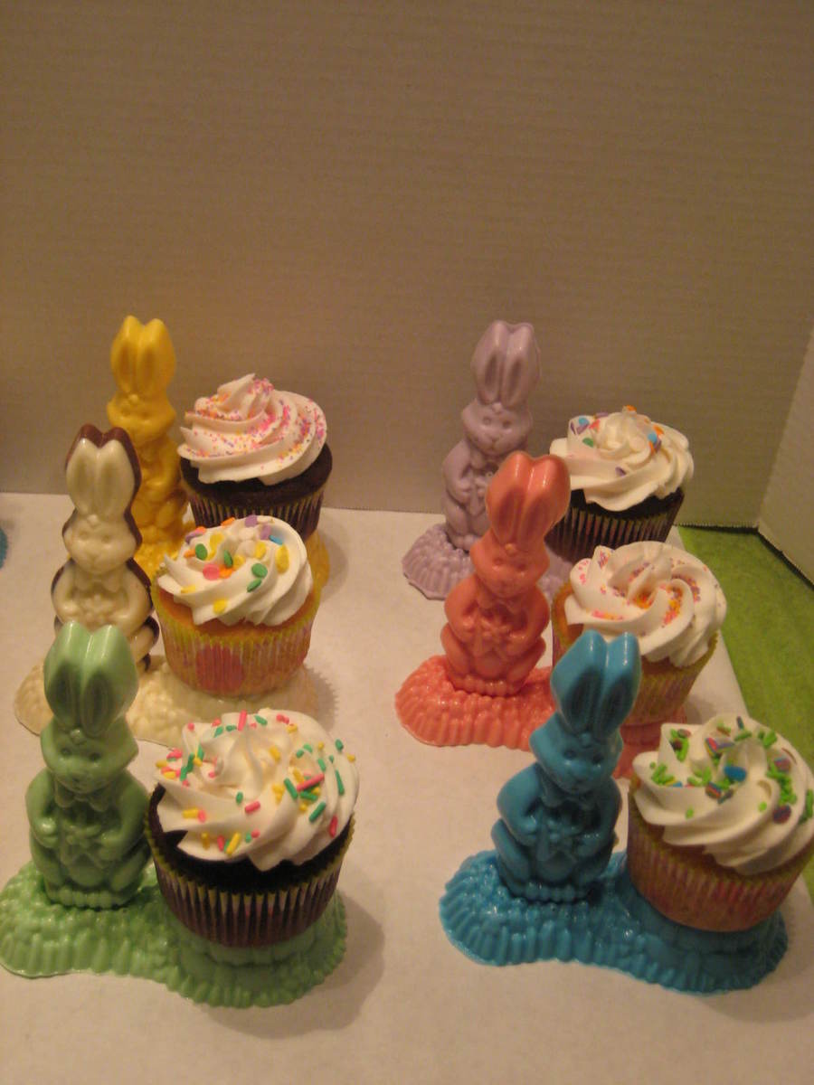I made these for my grand daughters 1st. grade Easter party. The bunnies & holders are made from a Wilton candy mold. I thought it would nice to make these and put the cupcakes in the little holder. The children will end up getting a cc & some chot. candy. Making these really took some time and I was starting to think I bite off more then I could chew, I made 20 of them and 40 cc's iced in BC. TFL, God Bless, Sharon