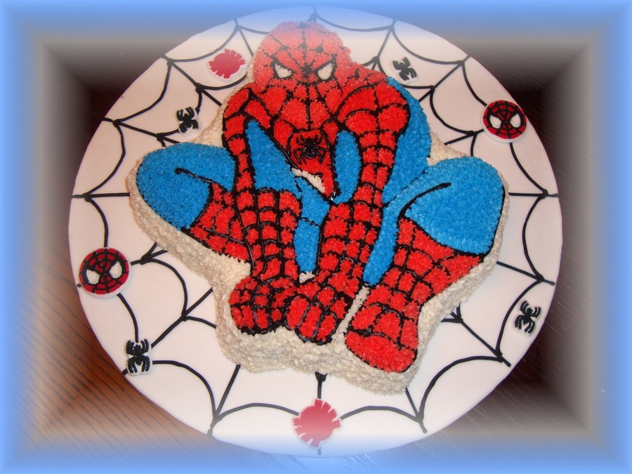 Classic Spiderman characher pan -- all buttercream. The board is covered with fondant; I drew a web with black buttercream icing.