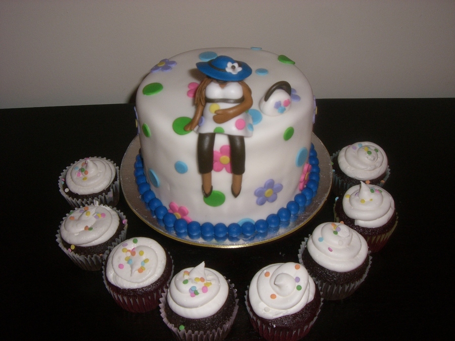 Pregnant women made of fondant. She looks "fatter" then I wanted but this was my first time making a person out of fondant.
