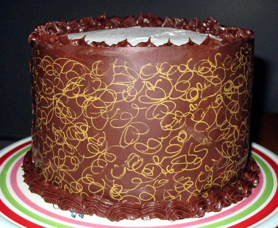 this is a three tier vanilla cake with raspberry preserve filling. The cake is decorated in a band of chocolate and finished off with chocolate and white buttercream frosting.