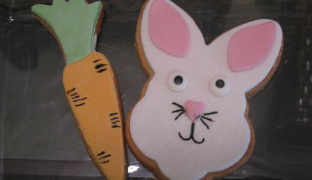 Fondant dasies, Marshmellow Peeps, and chocolate eggs with coconut grass. Thanks to everyone for their tips on the dasies!
