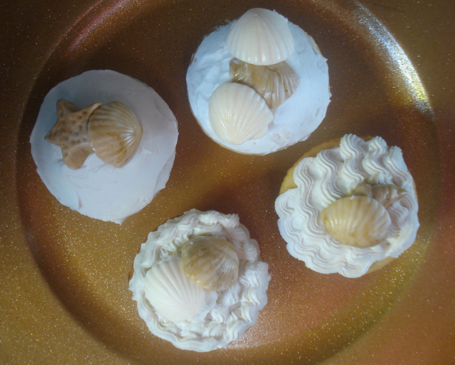 Vanilla cupcakes with shell & star toppings made from fondant.