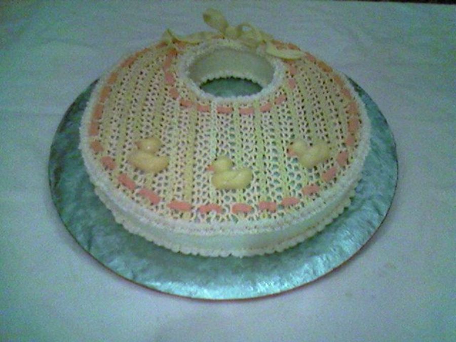 This is a cake for a baby shower. I made a buttercream with a combination of Italian Meringue and Creme Anglaise. You can find it in The Cake Bible. It takes a bit of work, but pipes wonderfully. The design for this cake was inspired by one of Colette Peters cakes, seen on her website. I used a Wilton Candy mold for the ducks. The bow and ribbons are sugar paste.