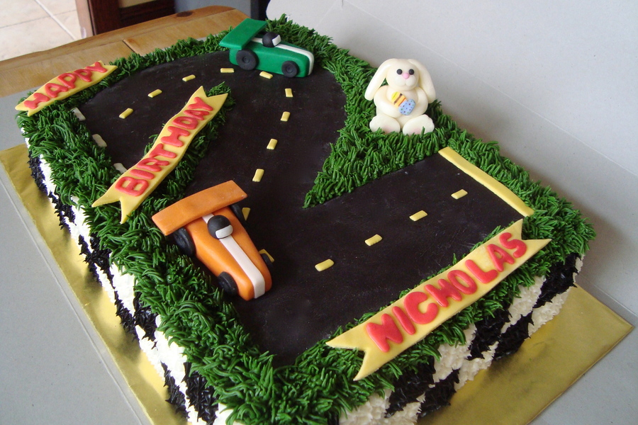 Chocolate cake covered in BC, with fondant track, cars and bunny.