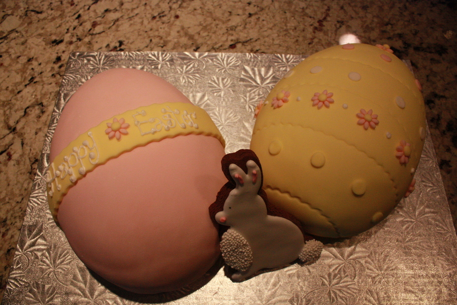2 Easter Egg Cakes (covered in fondant) with a chocolate cookie decorated in Royal Icing.