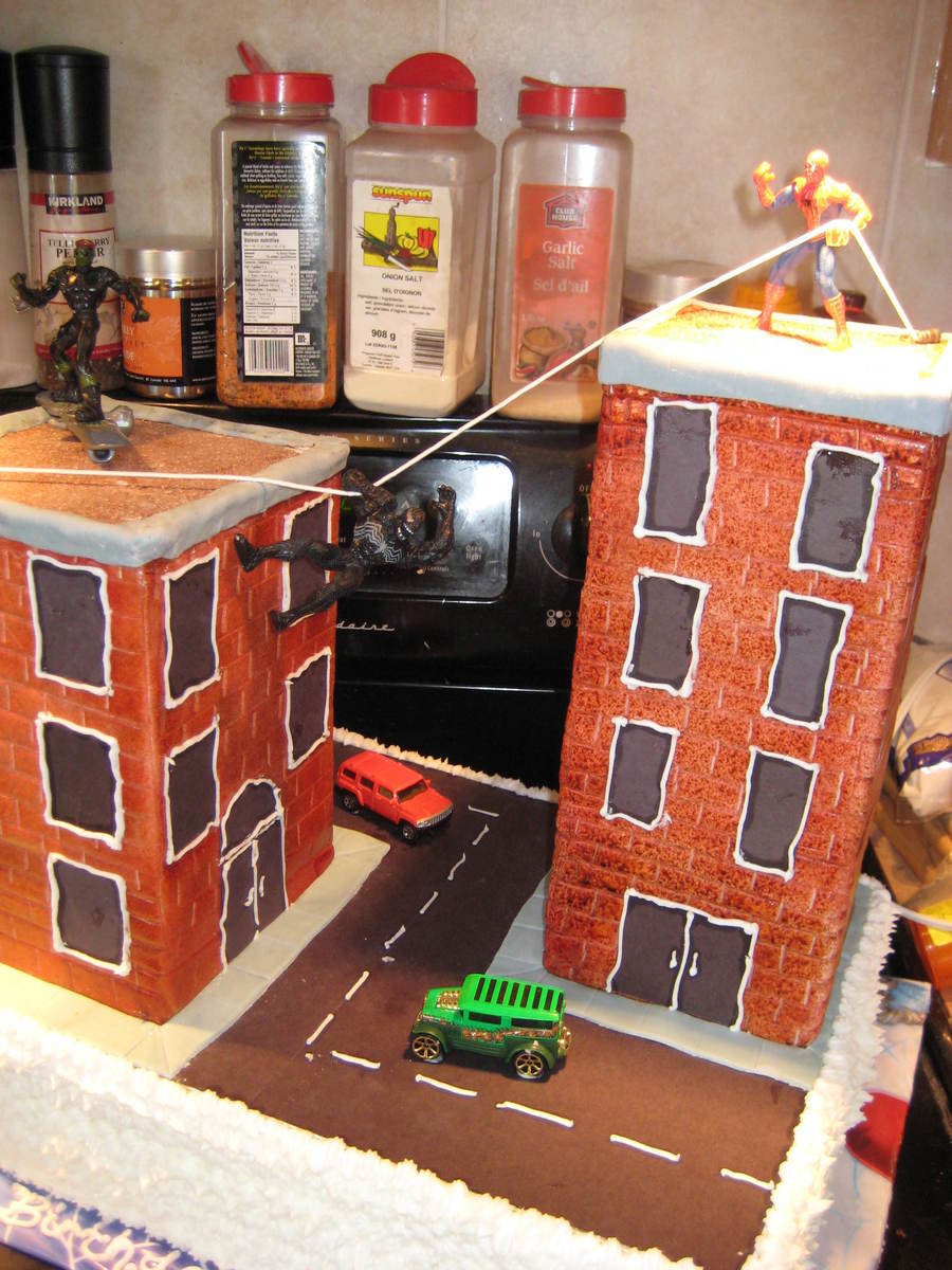 White/Chocolate cake with buttercream icing, buildings made out of styrofoam and fondant