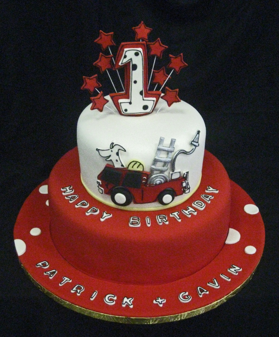 Inspired by the invitation (it had the firetruck on it), I created this for a set of twins. All fondant design,...firetruck cut with an exacto. Letters cut with cutters. Thanks for looking!
