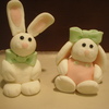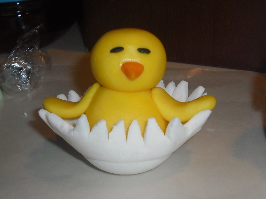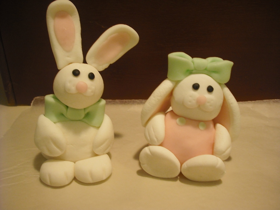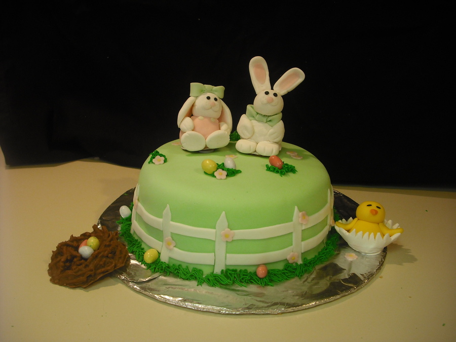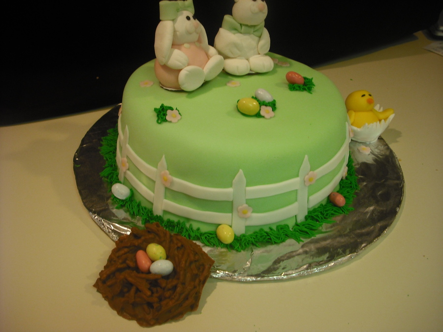 White cake with buttercream. Fondant covered and fondant fences and flowers. Nest made of melted chocolate and chow mein noodles. Gumpaste Bunnies and chick. Green buttercream for grass. TFL :)