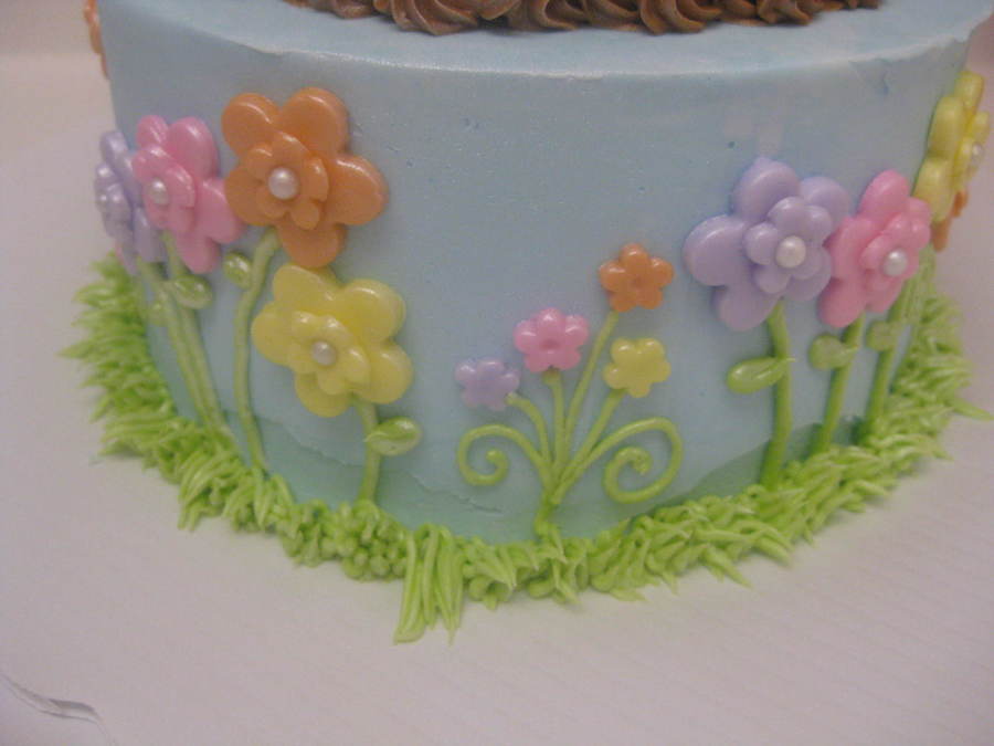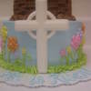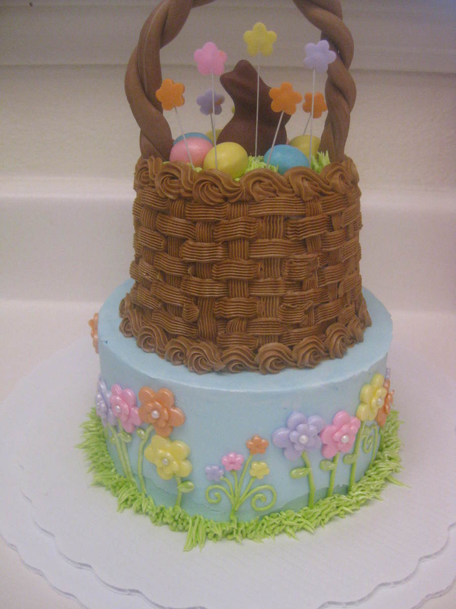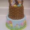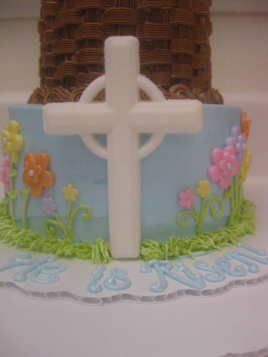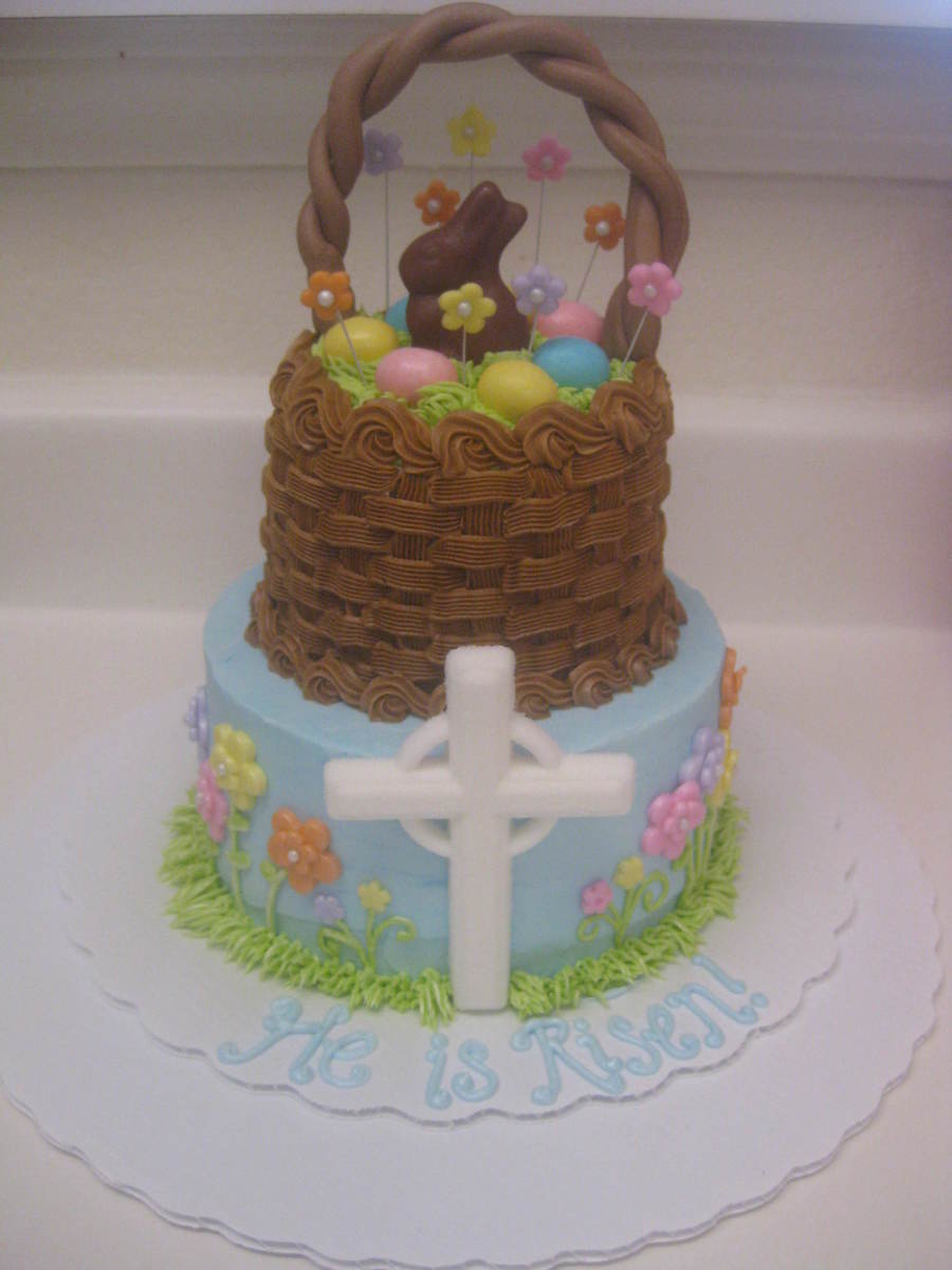 Mini 2-tier (4" on top of a 6") orange cake with raspberry buttercream filling. All buttercream icing with fondant basket handle & fondant flowers. Chocolate candy bunny & egg & the cross is molded sugar. Thanks for looking!