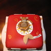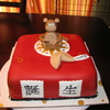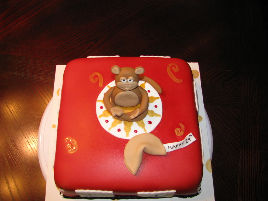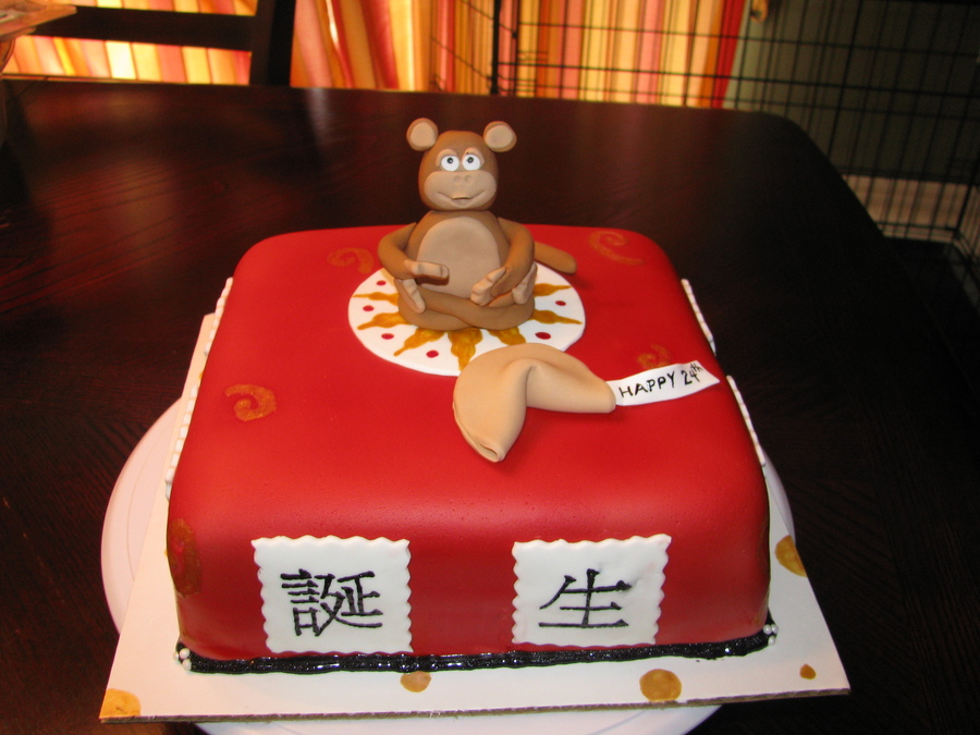Red Velvet cake with cream cheese frosting covered in fondant with Fondant decorations. A monkey on the cake is a tradition for the birthday girl apparently, so there is a meditating monkey in the middle and the japanese writing around the cake says Happy Birthday. Birthday girl loved it!