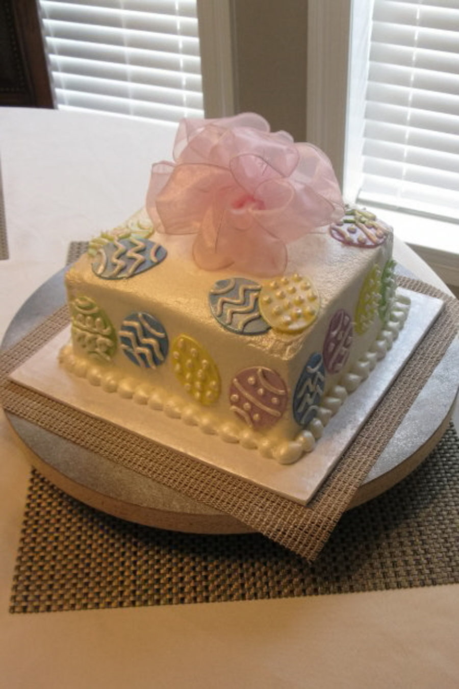 Red Velvet Cake w/ White Chocolate Cream Cheese Icing - 7-inch square - Satin Ice fondant accents and fabric bow - I used the Red Velvet Redux and Christeena's Cream Cheese Icing recipes here on CC.