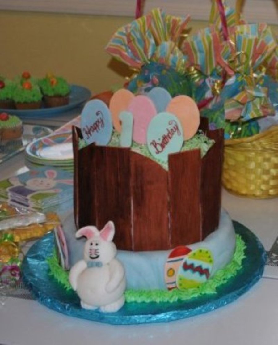 my nephews first birthday was on easter. i colored brown fondant and put woodgrain marks on it then painted it. i died coconut green to make it look like eater grass. the cake was 100% edible