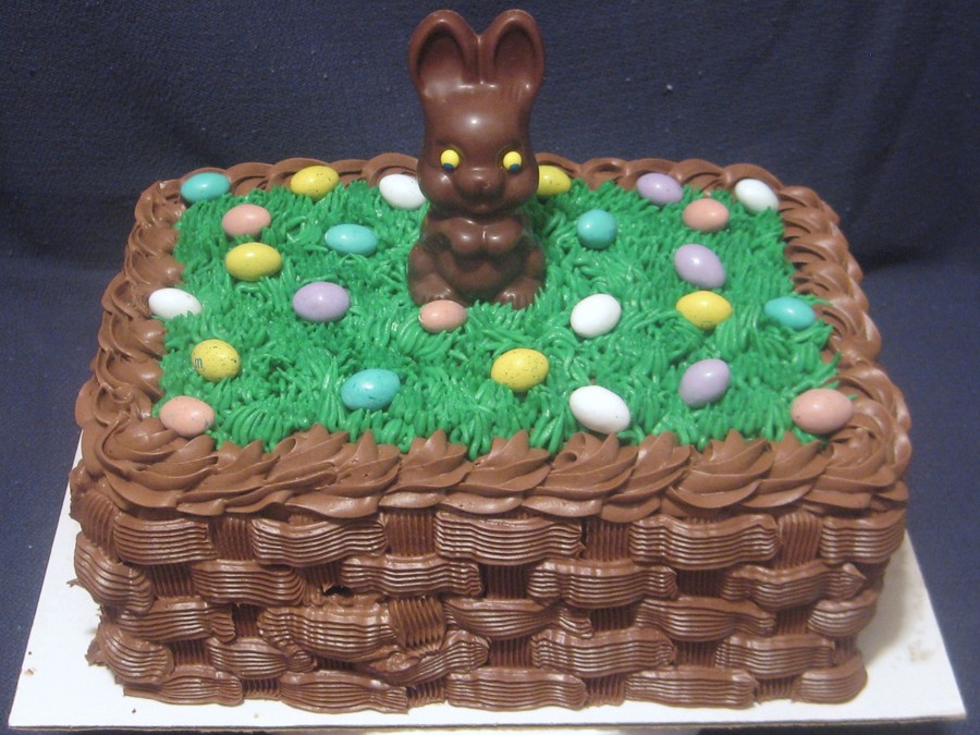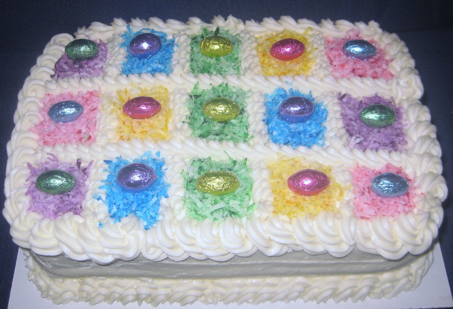 The white cake is a French Vanilla filled with Lemon and Iced in a Vanilla BC, topped with Colored Coconut and Mini Choc. Eggs ~~~ The green/yellow cake is a Carrot Cake with Golden Raisins and Walnuts, filled with sweet Cream Cheese and Iced in a lite Cream Cheese Butter Cream ~~~ and the choc cake is.. Triple Chocolate Fudge, filled with PB and Iced in a Milk Choc. Butter Cream. MC Easter Bunny and PB Eggs to top. Thanks fellow CCers for the inspiration on these cakes!