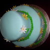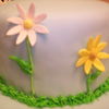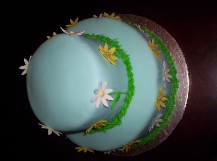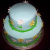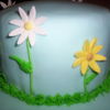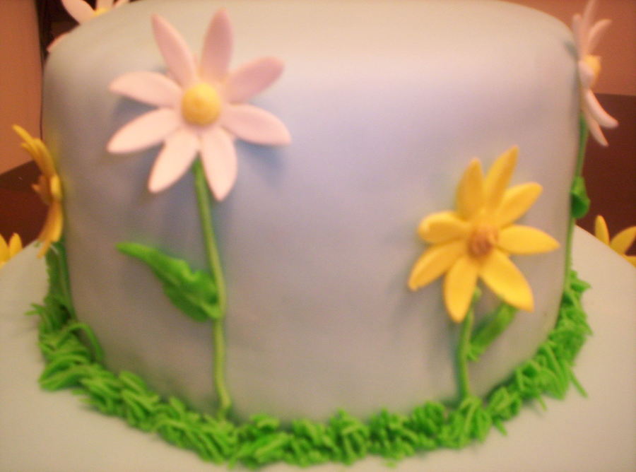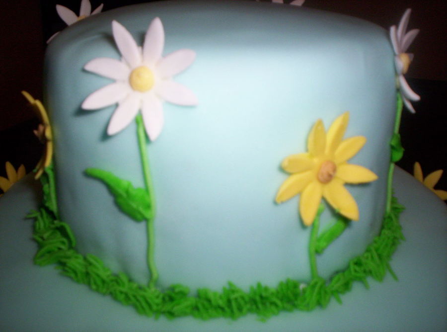 Blue fondant, Daisies are made of fondant with gum tex, stems and grass are green buttercream frosting.