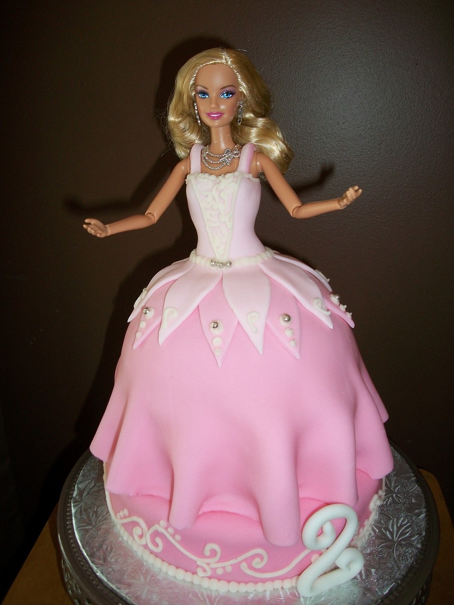 This was my first attempt at making a barbie cake. I used a half ball stacked onto a 6" round for the skirt, and stacked that onto an 8" round base. Marble cake, with chocolate mousse filling!