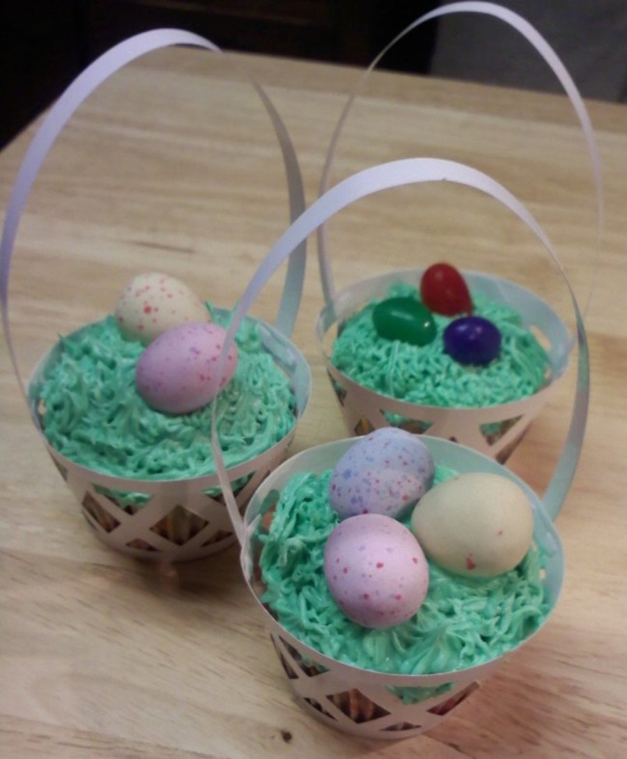 Carrot cake cupcakes with cream cheese frosting. The basket wrappers were purchased at Michaels, the eggs are jelly beans and candy-coated chocolate truffles.
