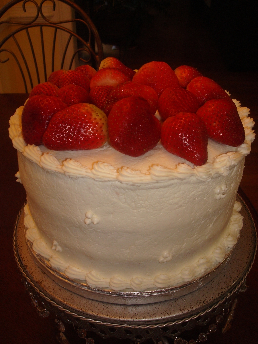 3 Layer cake covered with butter cream and topped with fresh strawberries.