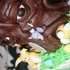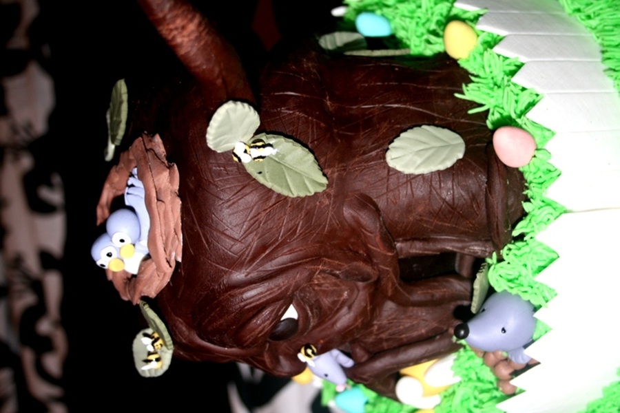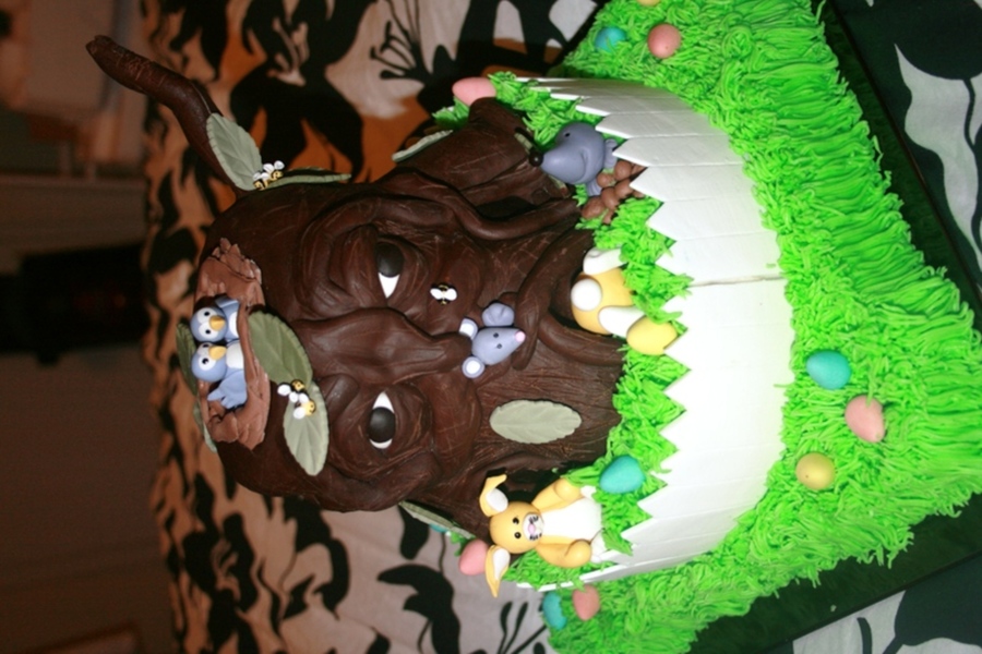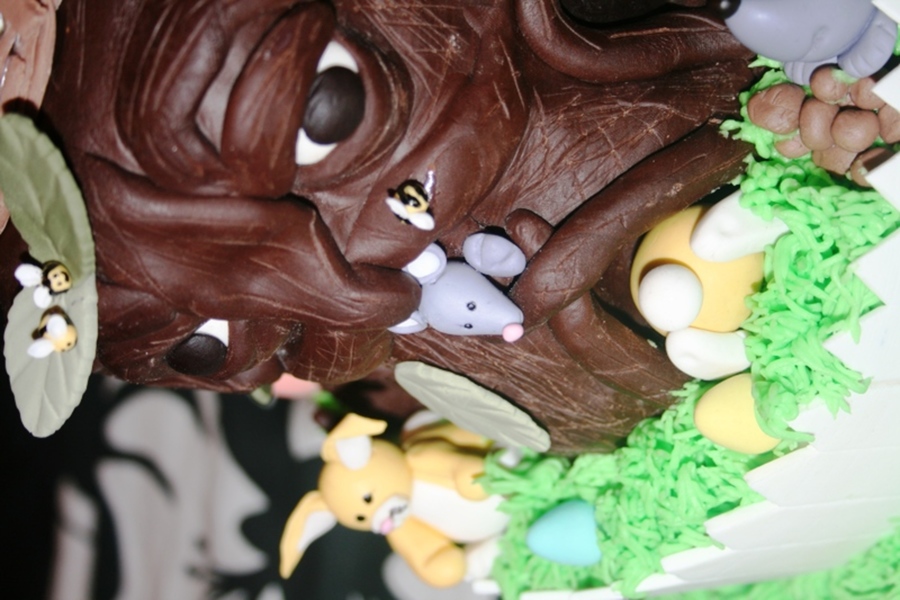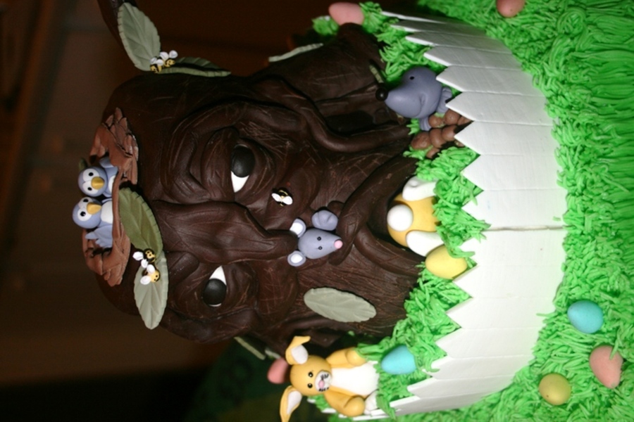 My version of the Enchanted Tree. No use of book just inspiration from fellow CC'ers. Tree in RKT and Modeling Chocolate with Gum-paste Accents/Figures. Tier 1: Round 8"Chocolate Caramel Cake with a Vanilla Buttercream/Easter Egg filling. Tier 2: Square 10" Very French Vanilla Cake with Vanilla Buttercream. Piped buttercream grass and Gum-paste fence/gate