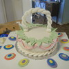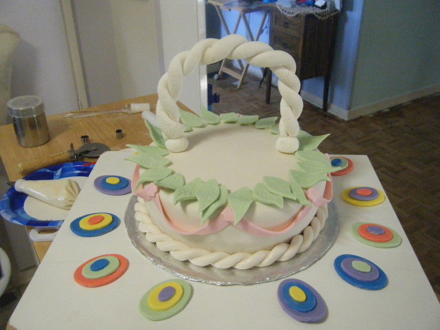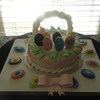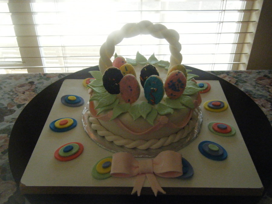 This is a cake you can find at Wilton's website. The cake is basic vanilla with a cream filling. The handle was made with gum paste, as well as the bow. The cake is covered in white fondant. The "eggs" on top are sugar cookies covered with butter cream which I dyed in several colors and I also used butter cream to attach a toothpick to the back of each cookie. The cake called for a pink three-wave swag thingy but I decided to go for one. My skills are not up there yet. The leaves and eggs around the cake were made of fondant a couple of days before that I let dry so they could get hard. This was my first time working with gum paste, and it was a learning experience.