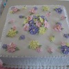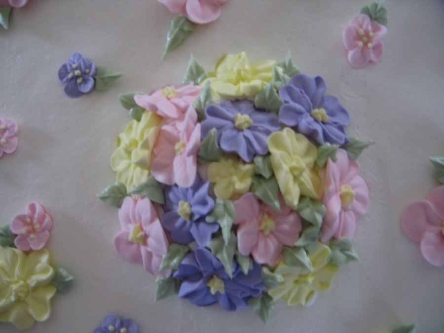 This cake was made for a bridal shower. It's a two-layer 12" square white almond sour cream cake with vanilla buttercream. The flowers are made from royal icing.