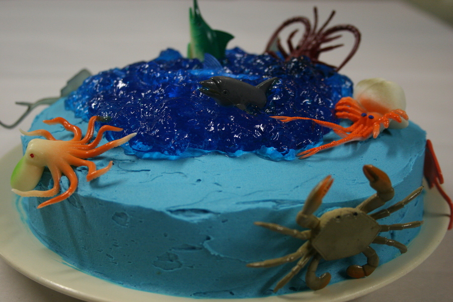 I made this for my birthday. It's a butter cake with buttercream icing and jelly water. The sea creatures are just plastic toys I found in a shop.