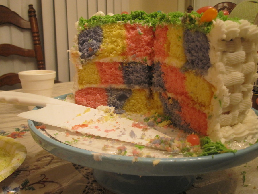 Easter basket cake, inspired by another user: tinytammy (thanks!) Checkerboard cake, with buttercream, royal icing, and sugar cookies.