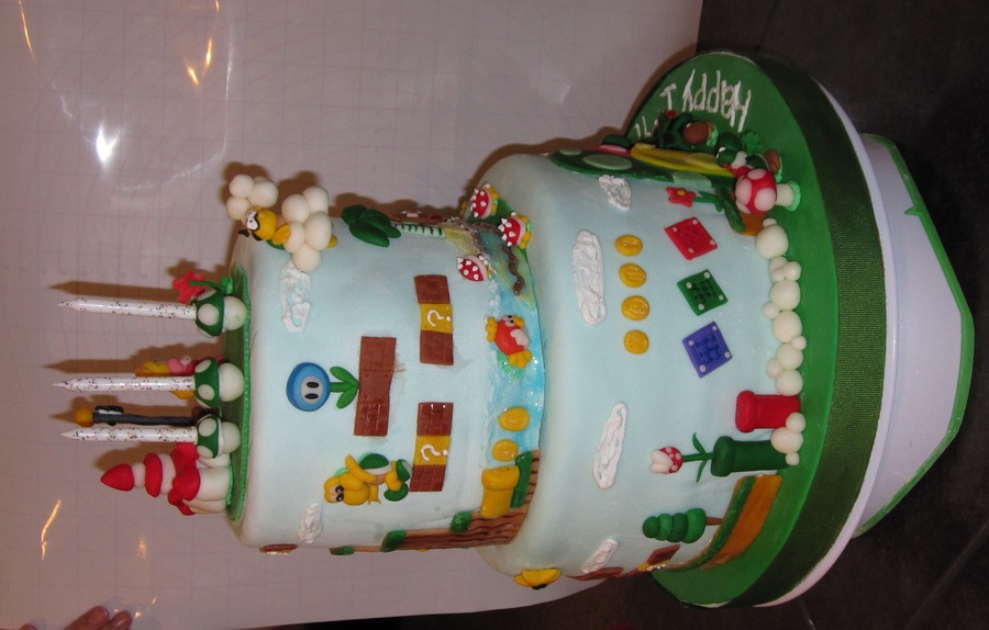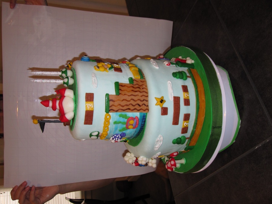 This cake I made for my husband, who is addicted to the new super mario brothers wii game! everything is made from fondant except the candles. I made all the characters in advance to let them hardern up.