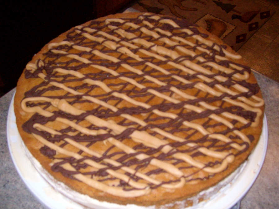 12" peanut butter cookie ice cream sandwich cake for my husband's birthday. Chocolate and peanut butter drizzle on top.