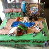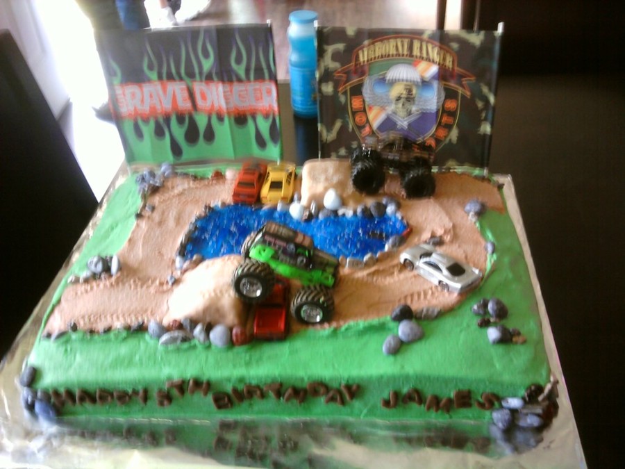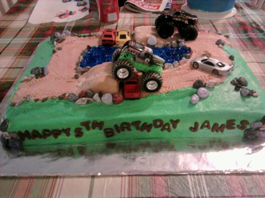 I did this cake for my grandson's 5th birthday. He wanted monster trucks, dirt and water on it. The trucks I purchased and they came with flags which I put on at the party and my pictures came out blurry so I don't have a pic. of it.