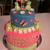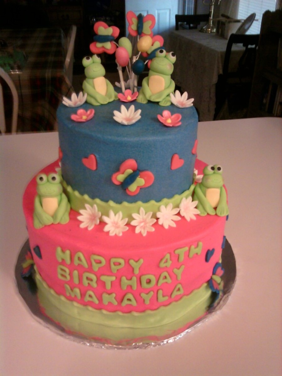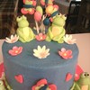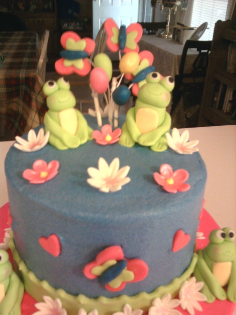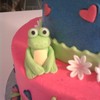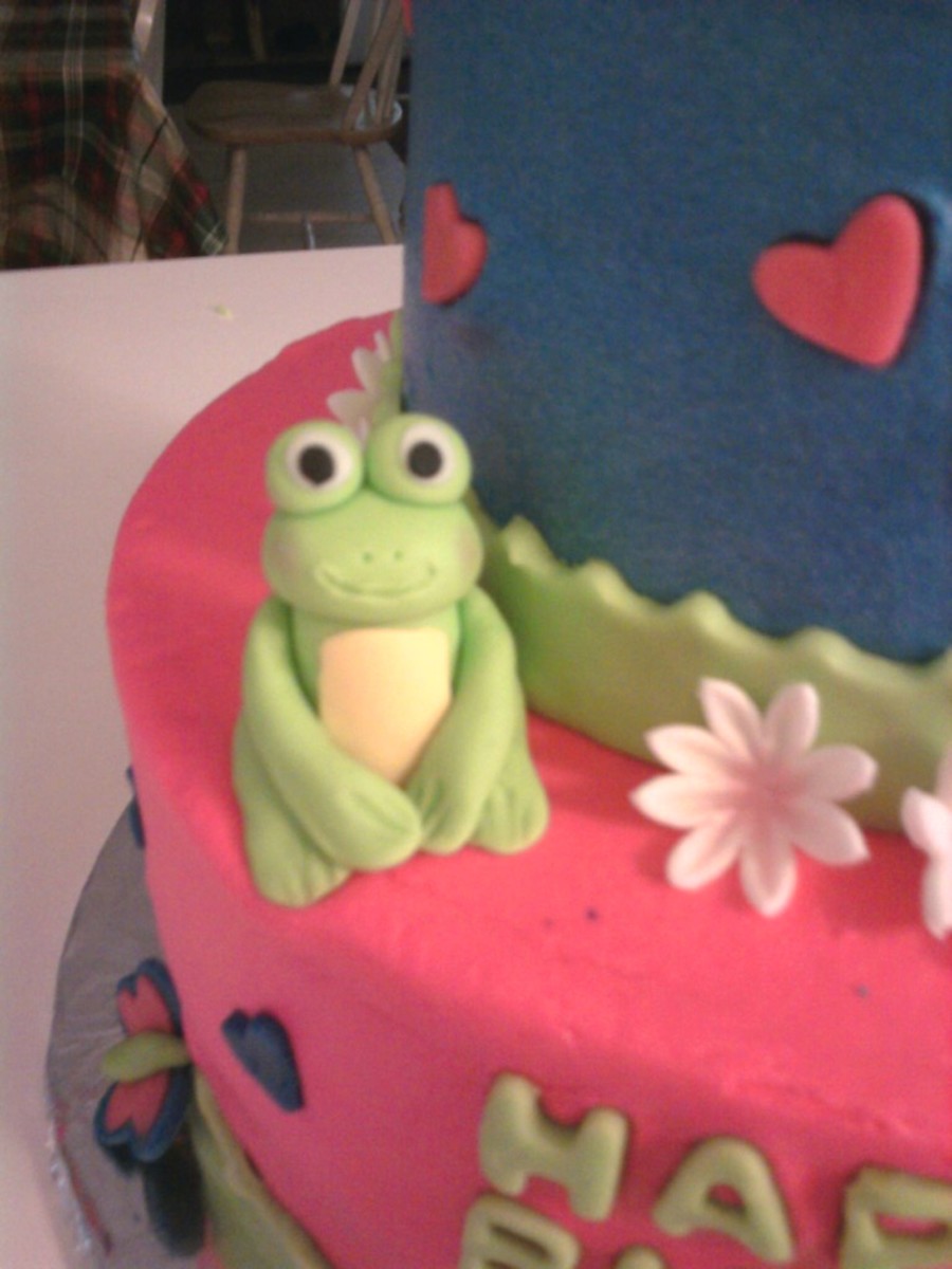 I did this cake for my granddaughter's 4th birthday. She wanted it hot pink and blue with frogs. The frogs and flowers are fondant/gumpaste the balloons, butterflies, name and hearts are modeling clay. I love that stuff!! very easy to work with. The cake was vanilla with mini choc. chips and buttercream icing