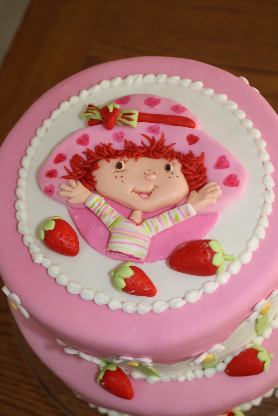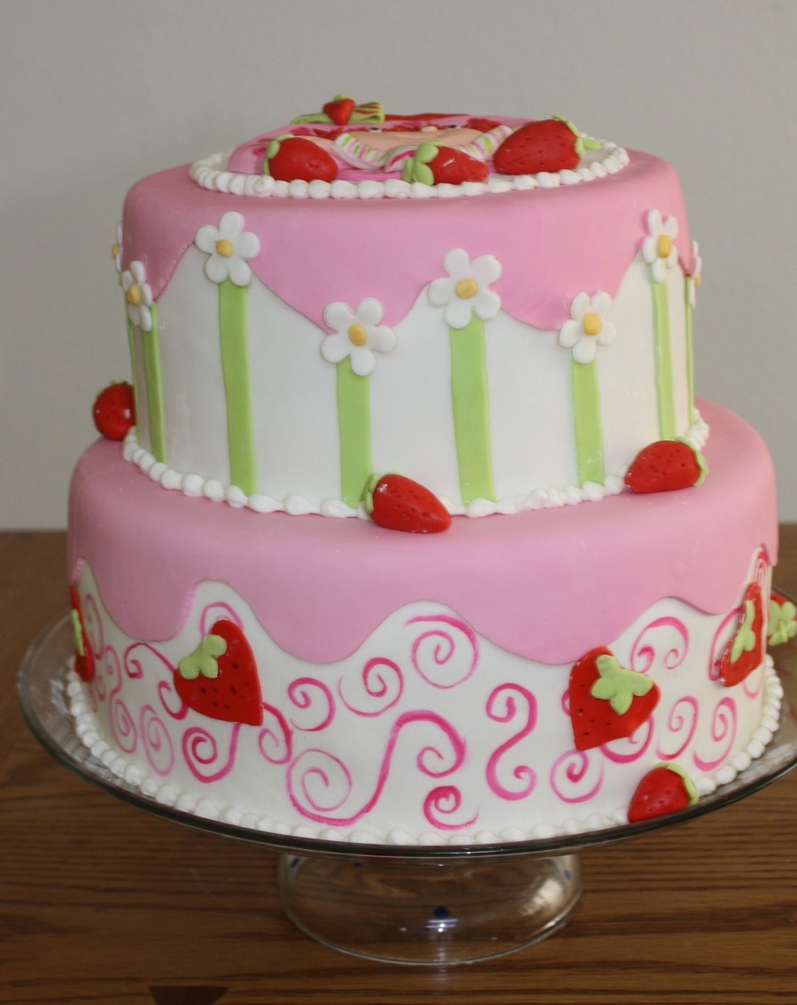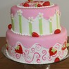 Two tiered cake wasc with strawberry filling. Covered with fondant. All decorations are fondant.