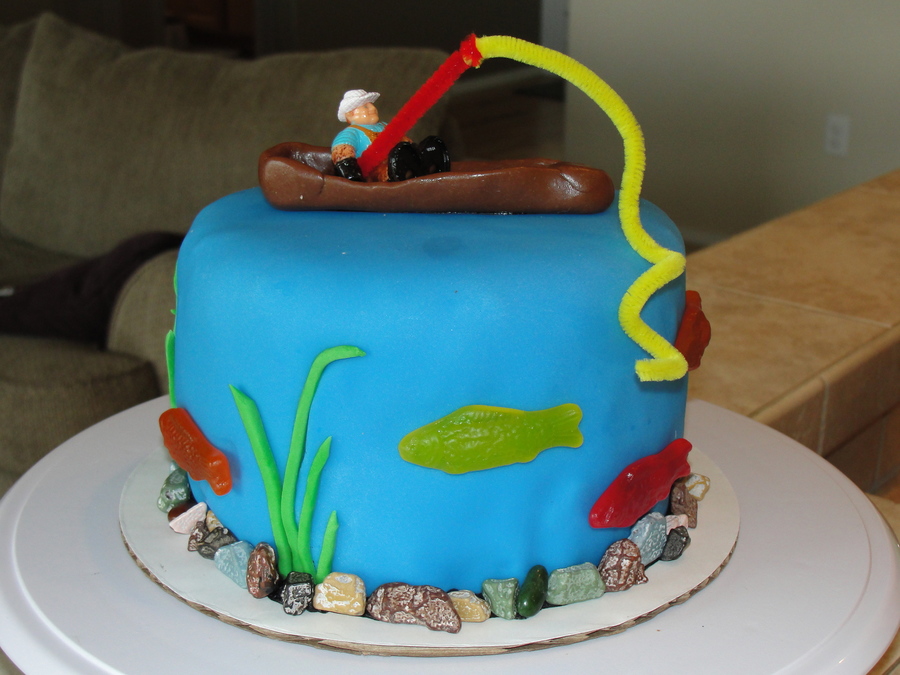 This cake was made with fondant, pipe cleaners, Tootsie Rolls, Swedish fish, and chocolate rocks, and a toy man!