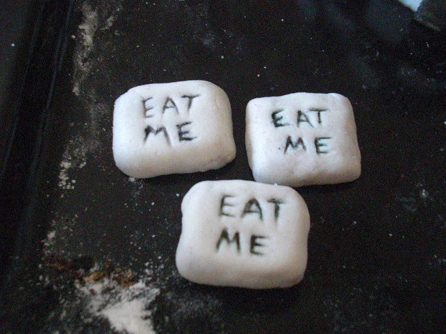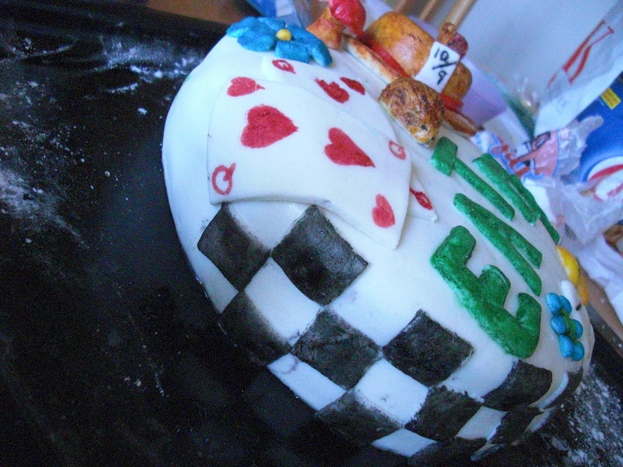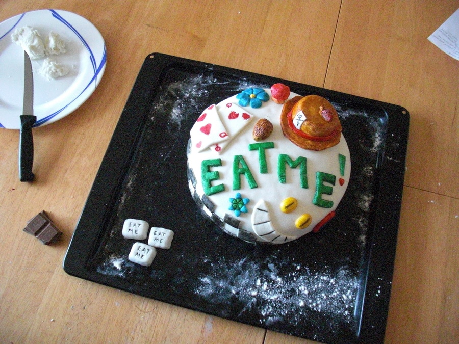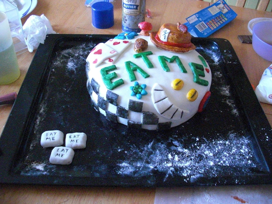 So I made this with my friend a few weeks ago but I figured it deserved a post. =) After approximately 7 hours of work and a LOT of sugar and food dye the Alice in Wonderland cake is complete! This was my friend Natalie and I's first attempt at a fondant cake and I must say we are pretty proud of how it turned out! The cake itself is Chocolate, we used a homemade marshmallow fondant recipe my sister gave me to cover the cake and make the decor. Cream cheese frosting held the two chocolate cakes together in the middle, and the three little 'eat me' cakes are chocolate squares covered with fondant with the words 'eat me' etched in black food coloring. btw It tasted AMAZING! =)