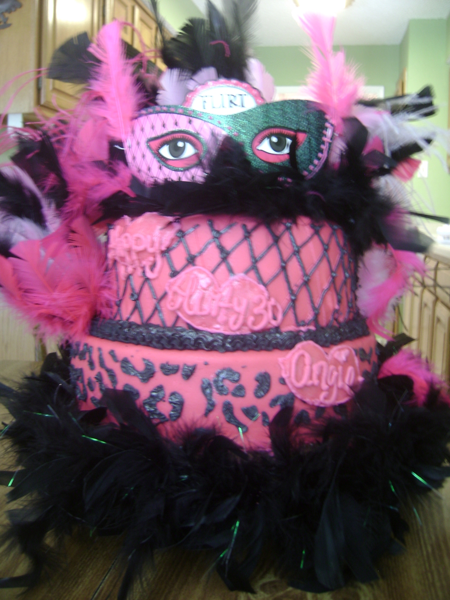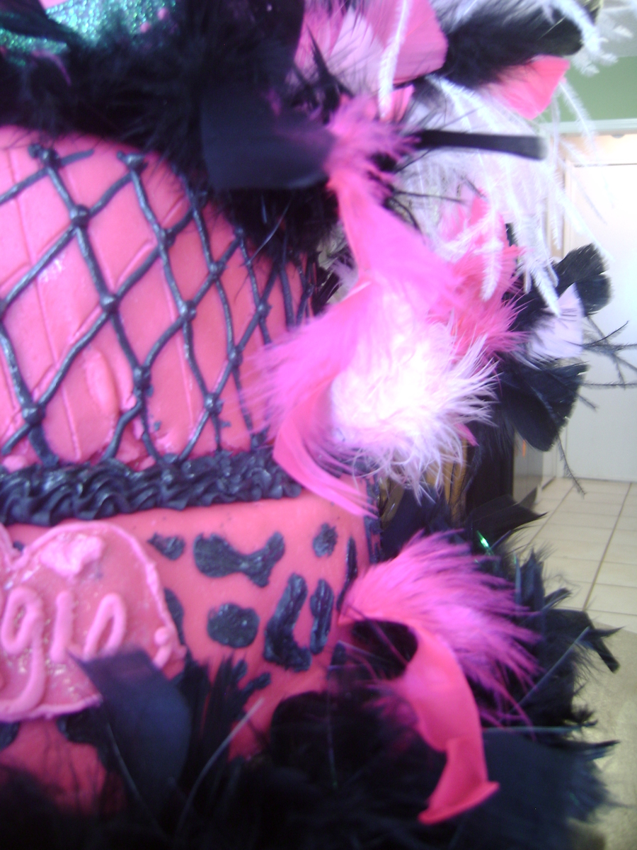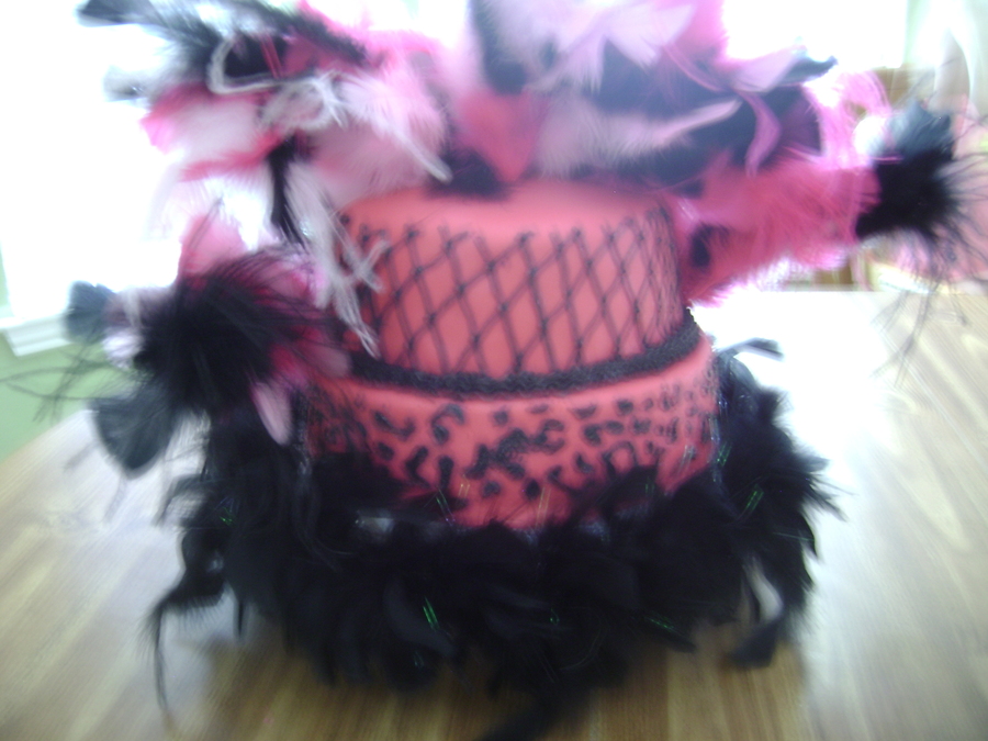 This is my first time working with fondant, it is for my cousins 30th birthday she wanted leopard on the botton tier and the top tier to look like fishnet stockings, I did my best. The cake is chocolate covered in fondant and royal icing accents, and feather boas. I should really take a class cause I had so many issuses with the fondant. Thankfully CC has so much great advice and was a big help in walking me through the cake. But with practice I hope my future cakes will look as flawless as many of the cakes on CC. Thanks everyone for all the ideas and help:)