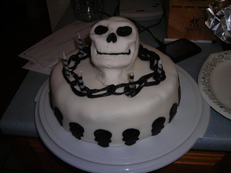 Skull head is solid fondant (stupid), i know better now. Baby skull heads all black fondant and chain was constructed from fondant. Cake is chocolate with vanilla frosting.