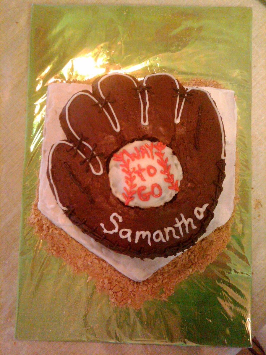 This was obviously inspired by all of you at CC, i feel that i definately could have done better had i done more research. I tried to do it all in butter cream, but unfortunately it did not crust so i could not make everything appear "smoth". Home plate cake is white cake with rasberry filling, top glove is just chocolate no filling.