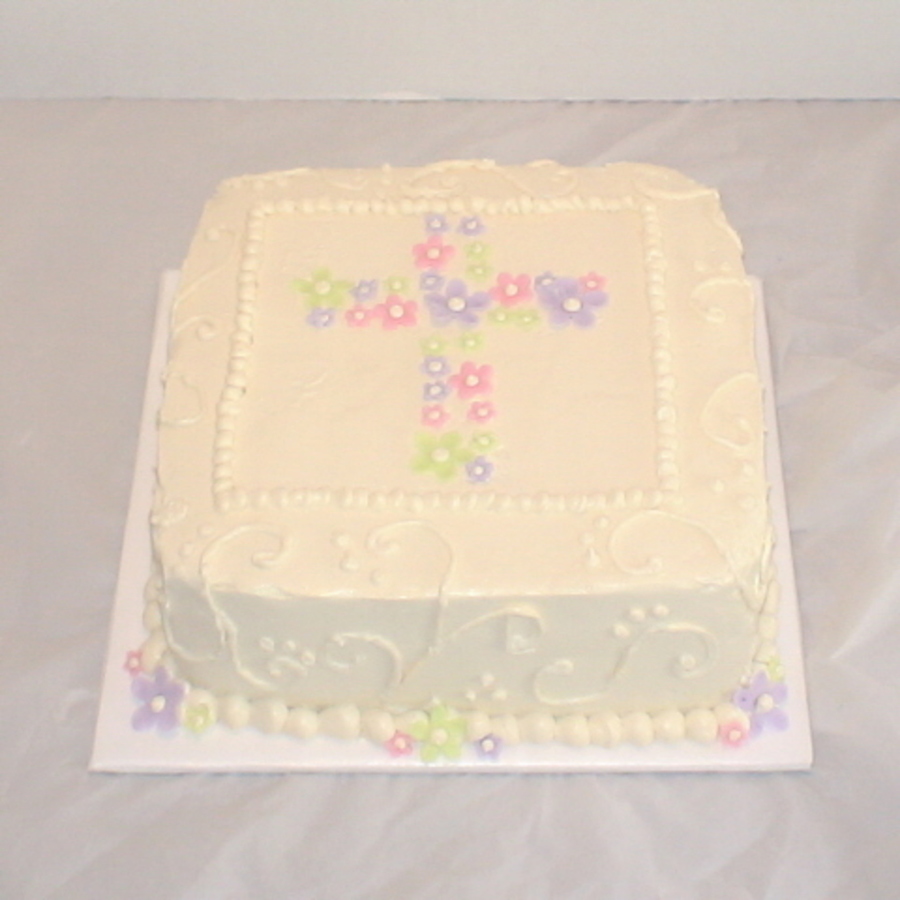 Cake for a baptism that took place on Easter. Finished in SMBC with fondant flower decoration.